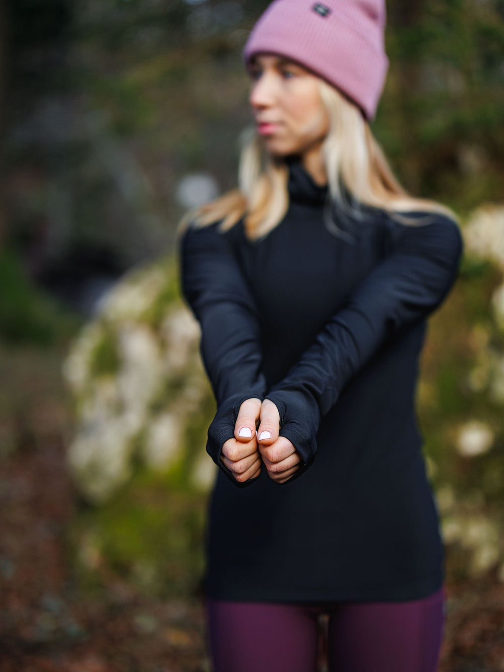 - Thumbholes hold sleeves in place