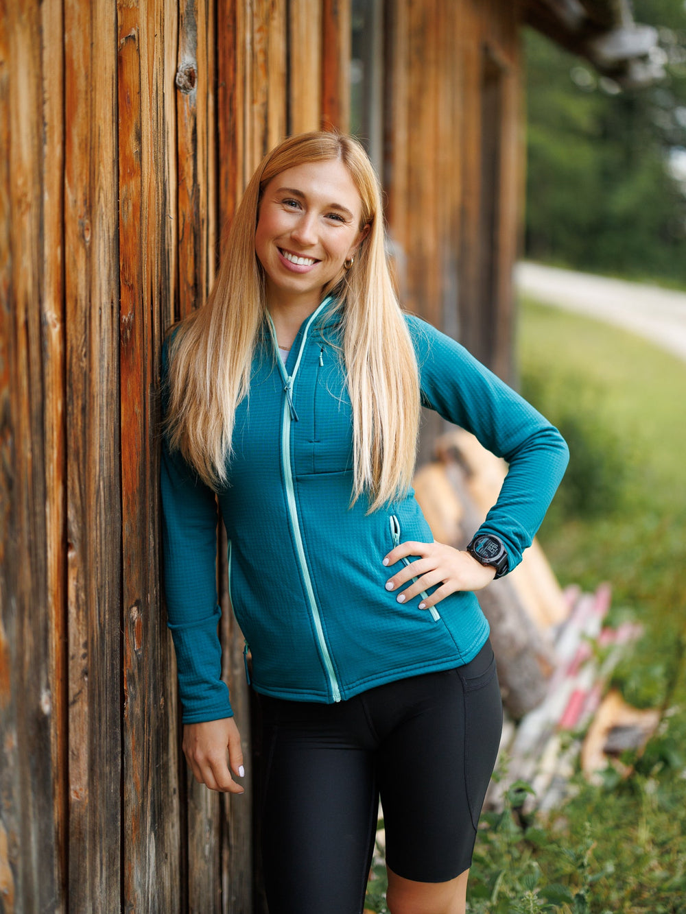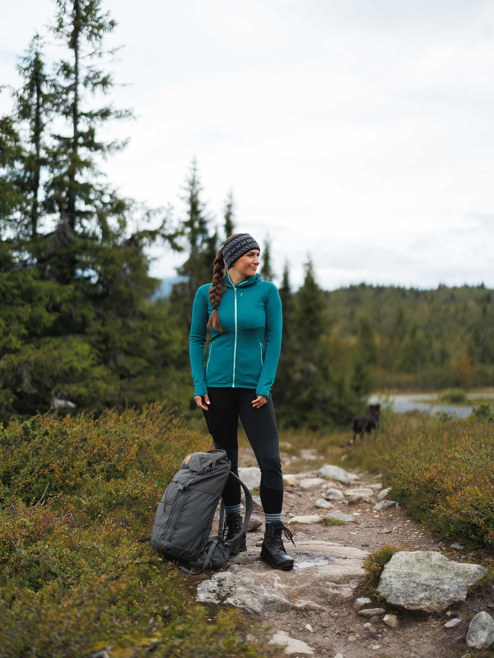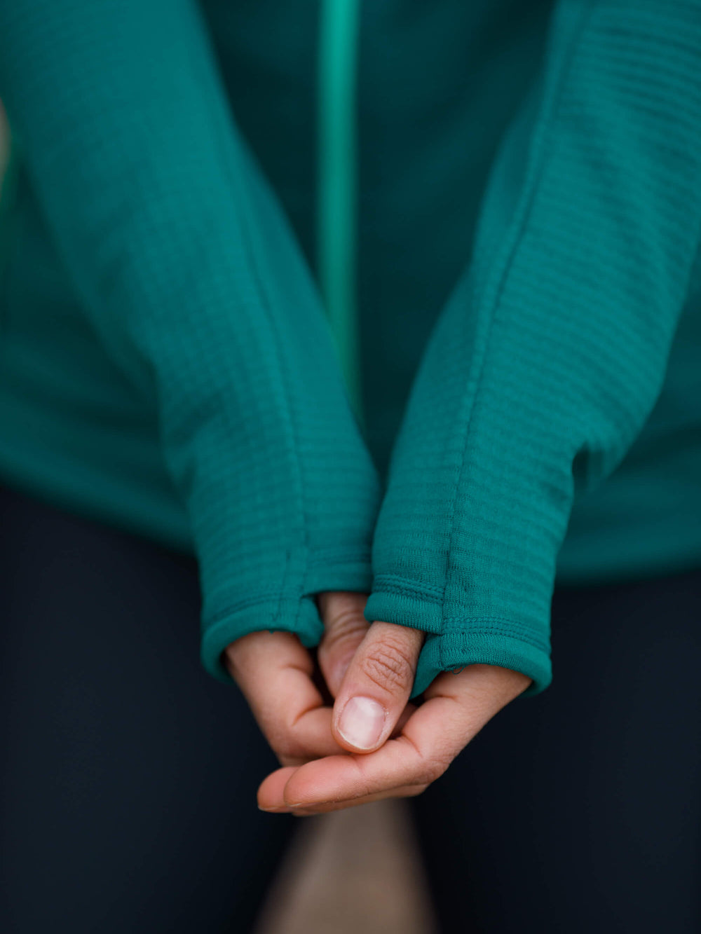 - Thumbhole cuffs and off-shoulder seams for comfort under backpack straps.