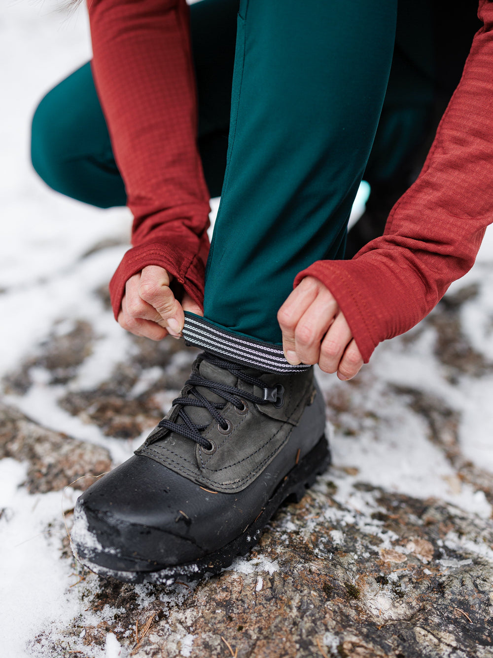 In order to adapt perfectly to ski boots as well as a variety of hiking boots, our APEX leggings have a zipper at the hem that can be opened as needed. A silicon grip on the cuffs ensures a secure fit, whichever boots you choose.